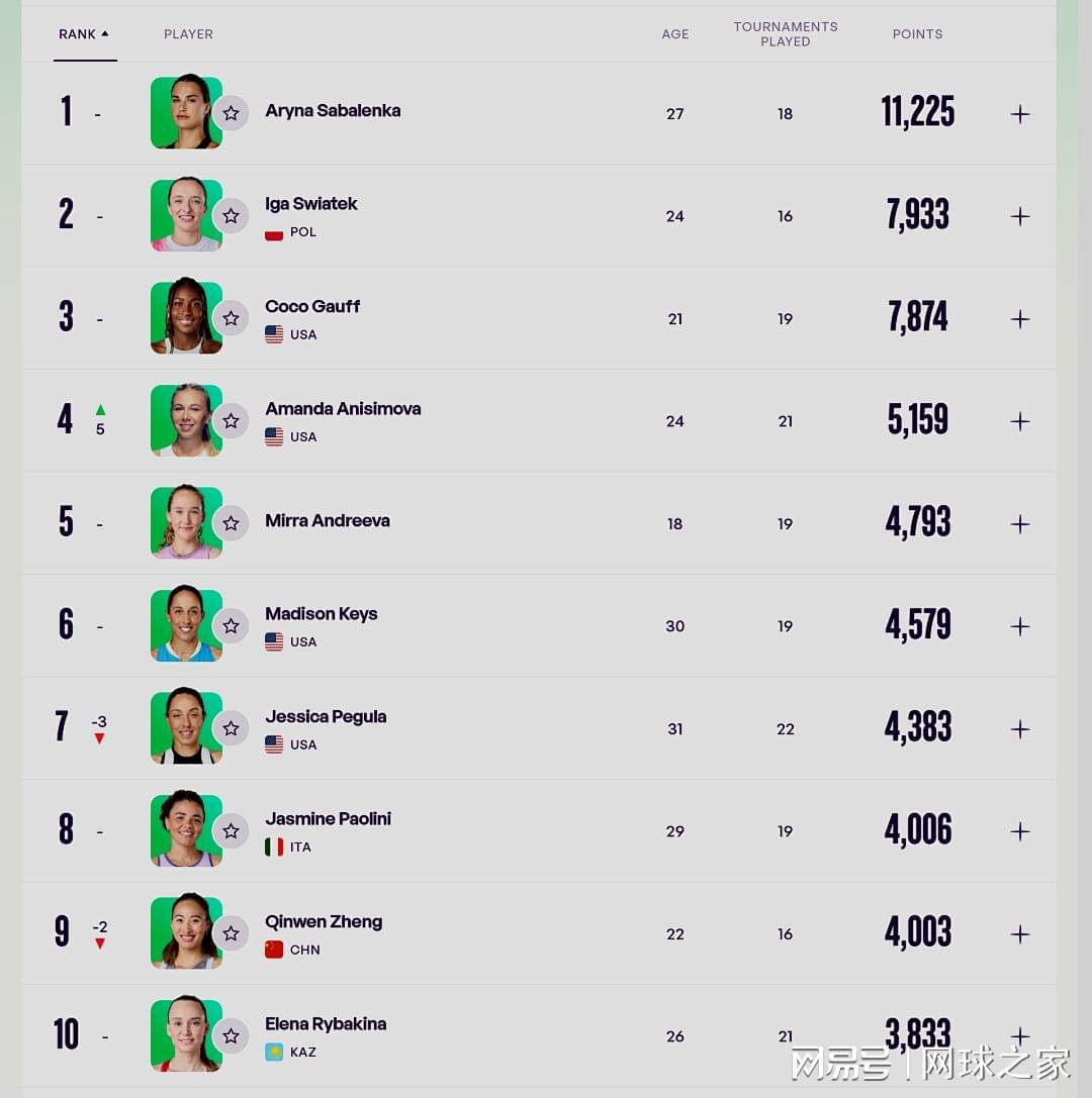女单方面:TOP10中的最大变化是美网亚军阿尼西莫娃首进TOP5,排在第四位。中国一姐郑钦文下滑至第九位,二姐王欣瑜位列第35位,其他金花都在100名开外。